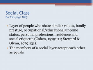 Each layer of social stratification constitutes a social class C. It is a societys ranking of people based on their access to valued resources such as wealth power and prestige. There are roughly equal numbers of people in each strata of society.